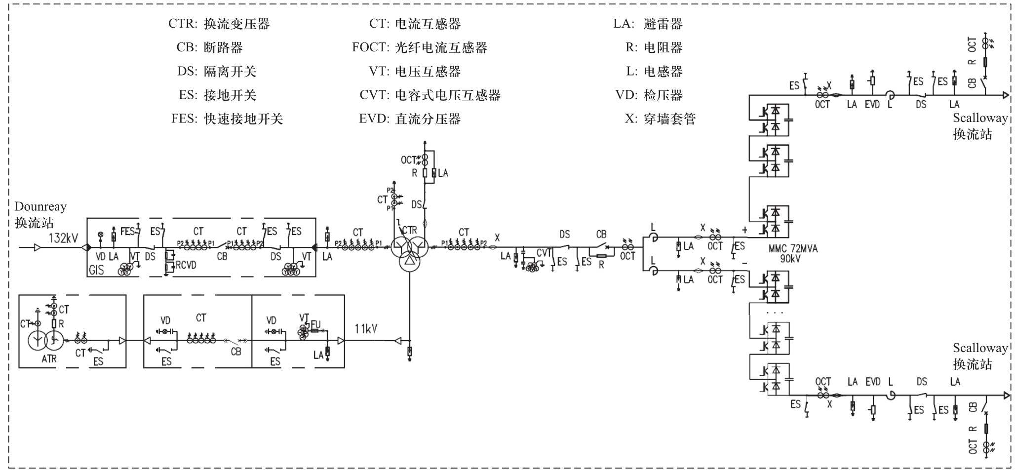 Dounreay站主接线如图 2所示。换流阀采用模块化多电平设计,每个桥臂由120个半桥子模块串联而成。