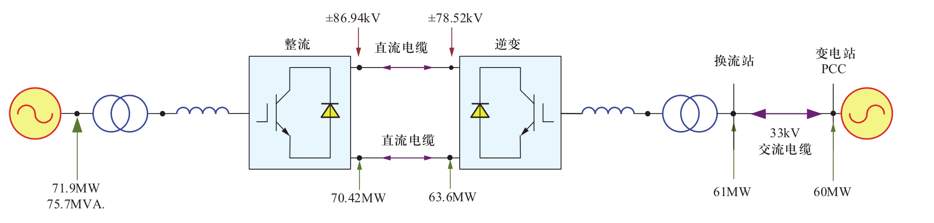 根据工程中对公共连接点(point of common coupling,PCC)有功功率60 MW、整流侧直流电压±88 kV的要求,并考虑换流站损耗、交直流电缆参数、公差等,设计了系统容量如图3所示。需要指出,系统设计中的PCC点一般在换流站的交流母线上,但针对英方业主要求,系统的PCC点设定在换流站经过一段交流电缆后的变电站处,因此在设计时考虑了交流电缆的损耗和压降。