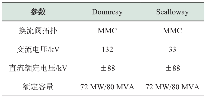 英国Shetland柔性直流工程连接Scotland大陆和Shetland岛,新建Dounreay和Scalloway 2座±88 kV柔性直流换流站,换流站额定容量为80 MVA,工程规划如图1所示。其中Dounreay站接入132 kV电压等级交流电网,Scalloway站接入33 kV电压等级交流电网。换流站间采用直流电缆连接,Dounreay站和Scalloway站间线路长约250 km。