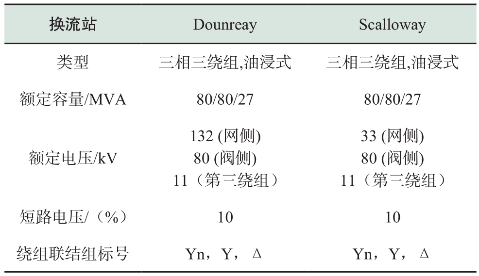 (2)根据系统运行功率范围确定了Dounreay和Scalloway换流站各关键设备的技术参数。换流阀额定容量为72 MW/80 MVA,联结变压器型式为三相三绕组油浸式,额定容量为80/80/27 MVA。桥臂电抗器、直流电抗器电感值分别为76 mH、30 mH。另外,为满足故障清除时间小于500 ms,两站均配备放电电阻800 Ω。