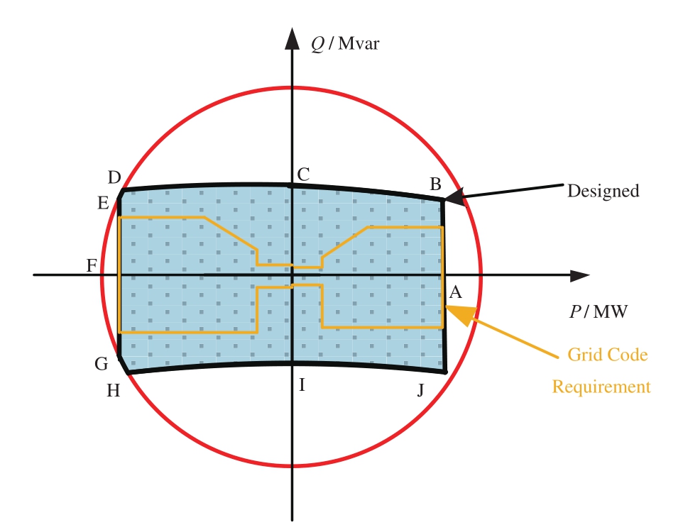 应用于海外柔性直流输电工程的主回路参数设计方法是基于英国Grid Code标准,根据功率运行范围的要求确定换流站的功率圆,计算换流阀、联结变压器、桥臂电抗器、直流电抗器、放电电阻等主设备的参数,并根据工程实际进行优化设计[9-12]。