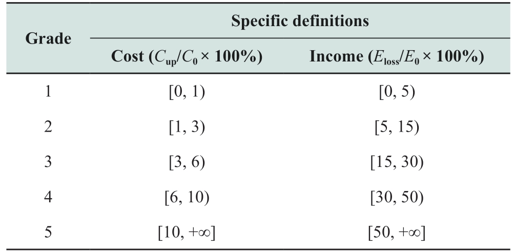 Grade Specific definitions Cost (Cup/C0 × 100%) Income (Eloss/E0 × 100%)1[0,1) [0,5)2[1,3) [5,15)3[3,6) [15,30)4[6,10) [30,50)5[10,+∞][50,+∞]
