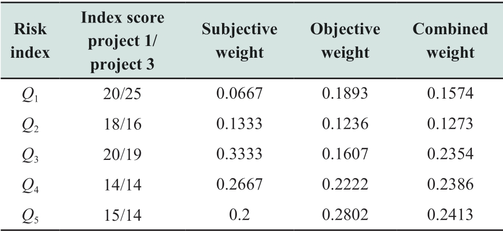 Risk index Index score project 1/project 3 Combined weight Q1 20/25 0.0667 0.1893 0.1574 Q2 18/16 0.1333 0.1236 0.1273 Q3 20/19 0.3333 0.1607 0.2354 Q4 14/14 0.2667 0.2222 0.2386 Q5 15/14 0.2 0.2802 0.2413 Subjective weight Objective weight