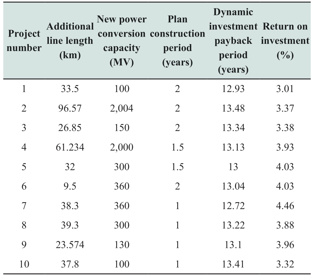 Project number Additional line length (km)New power conversion capacity (MV)Plan construction period (years)Dynamic investment payback period (years)Return on investment (%)1 33.5 100 2 12.93 3.01 2 96.57 2,004 2 13.48 3.37 3 26.85 150 2 13.34 3.38 4 61.234 2,000 1.5 13.13 3.93 5 32 300 1.5 13 4.03 6 9.5 360 2 13.04 4.03 7 38.3 360 1 12.72 4.46 8 39.3 300 1 13.22 3.88 9 23.574 130 1 13.1 3.96 10 37.8 100 1 13.41 3.32