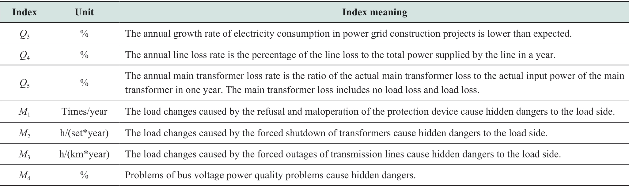 Index Unit Index meaning Q3 % The annual growth rate of electricity consumption in power grid construction projects is lower than expected.Q4 % The annual line loss rate is the percentage of the line loss to the total power supplied by the line in a year.Q5 % The annual main transformer loss rate is the ratio of the actual main transformer loss to the actual input power of the main transformer in one year.The main transformer loss includes no load loss and load loss.M1 Times/year The load changes caused by the refusal and maloperation of the protection device cause hidden dangers to the load side.M2 h/(set*year) The load changes caused by the forced shutdown of transformers cause hidden dangers to the load side.M3 h/(km*year) The load changes caused by the forced outages of transmission lines cause hidden dangers to the load side.M4 % Problems of bus voltage power quality problems cause hidden dangers.