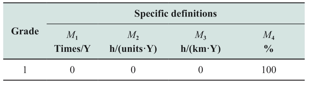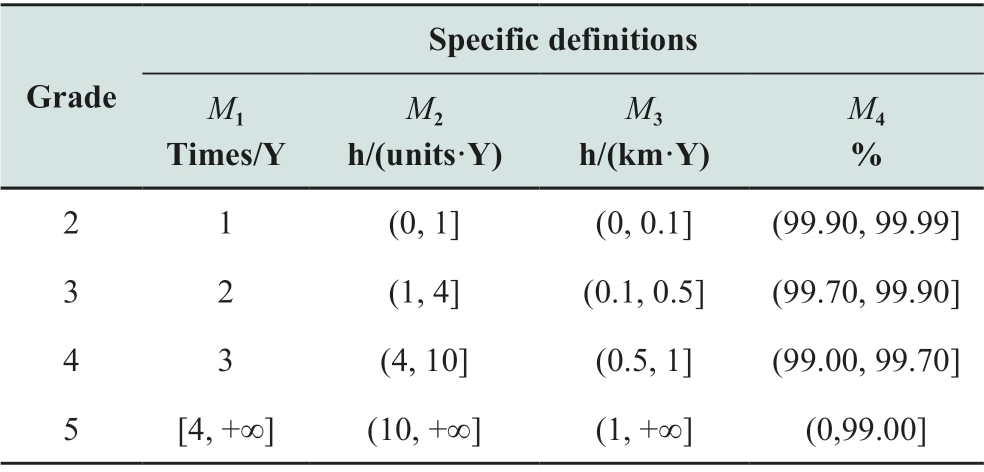 Specific definitions Grade M1 M2 M3 Times/Y h/(units·Y)h/(km·Y)M4%2 1 (0,1](0,0.1](99.90,99.99]3 2 (1,4](0.1,0.5](99.70,99.90]4 3 (4,10](0.5,1](99.00,99.70]5 [4,+∞](10,+∞](1,+∞](0,99.00]