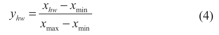 where xmax is the maximum value of the sample data and xmin is the minimum value of the sample data.The advantage of this method is that,regardless of whether the index value is positive or negative,the normalized index satisfies 0 ≤ yhw ≤1 after range transformation,and the positive and negative indexes all become positive indexes,with 1 as the optimal value and 0 as the worst value.However,an obvious drawback of this method is that,when new data are added,this may cause a change in the maximum and minimum values,which need to be redefined.The processing result of this method is mainly related to the maximum and minimum index values,so it is applicable to cases in which the maximum and minimum values are certain and unchanged.