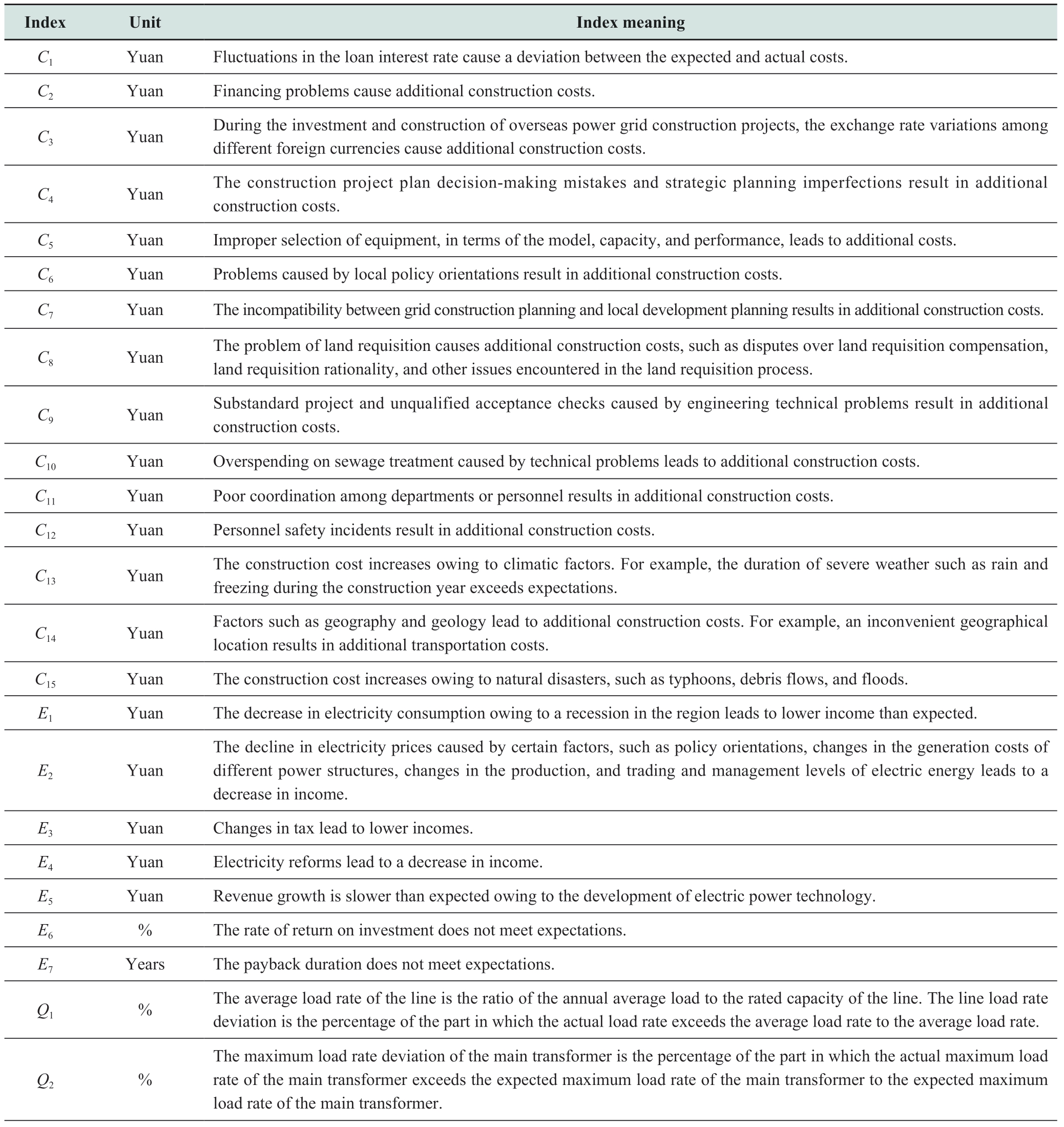 Index Unit Index meaning C1 Yuan Fluctuations in the loan interest rate cause a deviation between the expected and actual costs.C2 Yuan Financing problems cause additional construction costs.C3 Yuan During the investment and construction of overseas power grid construction projects,the exchange rate variations among different foreign currencies cause additional construction costs.C4 Yuan The construction project plan decision-making mistakes and strategic planning imperfections result in additional construction costs.C5 Yuan Improper selection of equipment,in terms of the model,capacity,and performance,leads to additional costs.C6 Yuan Problems caused by local policy orientations result in additional construction costs.C7 Yuan The incompatibility between grid construction planning and local development planning results in additional construction costs.C8 Yuan The problem of land requisition causes additional construction costs,such as disputes over land requisition compensation,land requisition rationality,and other issues encountered in the land requisition process.C9 Yuan Substandard project and unqualified acceptance checks caused by engineering technical problems result in additional construction costs.C10 Yuan Overspending on sewage treatment caused by technical problems leads to additional construction costs.C11 Yuan Poor coordination among departments or personnel results in additional construction costs.C12 Yuan Personnel safety incidents result in additional construction costs.C13 Yuan The construction cost increases owing to climatic factors.For example,the duration of severe weather such as rain and freezing during the construction year exceeds expectations.C14 Yuan Factors such as geography and geology lead to additional construction costs.For example,an inconvenient geographical location results in additional transportation costs.C15 Yuan The construction cost increases owing to natural disasters,such as typhoons,debris flows,and floods.E1 Yuan The decrease in electricity consumption owing to a recession in the region leads to lower income than expected.The decline in electricity prices caused by certain factors,such as policy orientations,changes in the generation costs of different power structures,changes in the production,and trading and management levels of electric energy leads to a decrease in income.E3 Yuan Changes in tax lead to lower incomes.E4 Yuan Electricity reforms lead to a decrease in income.E5 Yuan Revenue growth is slower than expected owing to the development of electric power technology.E6 % The rate of return on investment does not meet expectations.E7 Years The payback duration does not meet expectations.Q1 % The average load rate of the line is the ratio of the annual average load to the rated capacity of the line.The line load rate deviation is the percentage of the part in which the actual load rate exceeds the average load rate to the average load rate.E2 Yuan Q2 %The maximum load rate deviation of the main transformer is the percentage of the part in which the actual maximum load rate of the main transformer exceeds the expected maximum load rate of the main transformer to the expected maximum load rate of the main transformer.