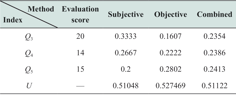 Method Index Evaluation score Subjective Objective Combined Q3 20 0.3333 0.1607 0.2354 Q4 14 0.2667 0.2222 0.2386 Q5 15 0.2 0.2802 0.2413 U— 0.51048 0.527469 0.51122