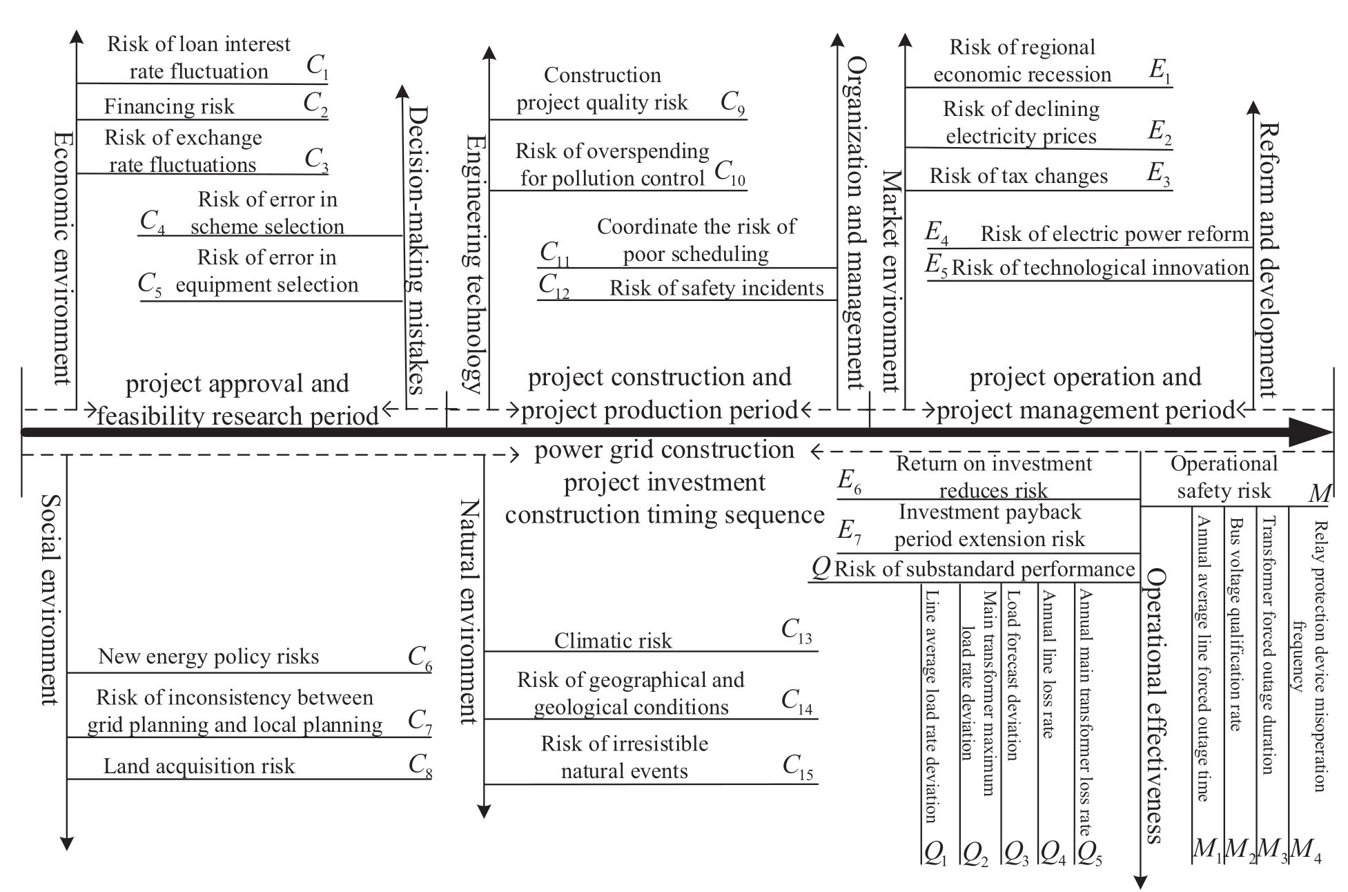 The power grid project will enter the formal operation and management stage after the construction and trial operation.If all stages are completed properly,the project operation and production will be likely to provide investors with the expected benefits.Moreover,the functioning and efficiency,as well as security and reliability,of the grid project should meet the changing market supply and demand.The power grid project must also adapt to reforms and development,improve the competitiveness and share rate,and maintain the expected investment benefits.Therefore,the risk factors are analyzed according to the market environment and are combined with the perspectives of reform development and operational effectiveness.