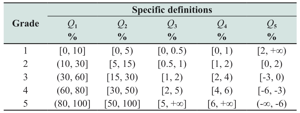 Specific definitions Grade Q1%Q2%Q3%Q4%Q5%1 [0,10][0,5) [0,0.5) [0,1) [2,+∞)2 (10,30][5,15) [0.5,1) [1,2) [0,2)3 (30,60][15,30) [1,2) [2,4) [-3,0)4 (60,80][30,50) [2,5) [4,6) [-6,-3)5 (80,100][50,100][5,+∞][6,+∞](-∞,-6)