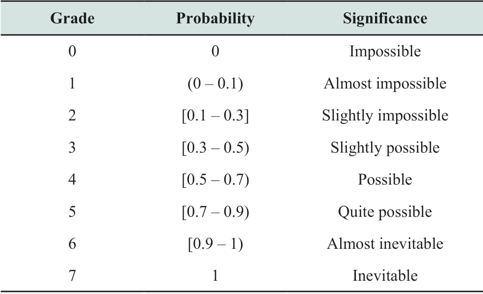 Grade Probability Significance 0 0 Impossible(0 - 0.1) Almost impossible 2[0.1 - 0.3]Slightly impossible 3[0.3 - 0.5) Slightly possible 4[0.5 - 0.7) Possible 5[0.7 - 0.9) Quite possible 6[0.9 - 1) Almost inevitable 7 1 Inevitable 1