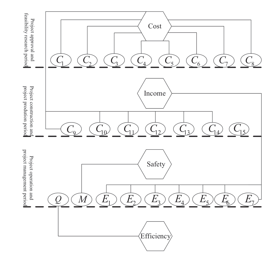 By analyzing the risk consequences resulting from the risk factors at three different stages in the time sequence of the investment and construction of power grid projects,the risk indexes can be classified and analyzed according to the different aspects of the consequences (cost,income,safety,and efficiency),as illustrated in Fig.2.