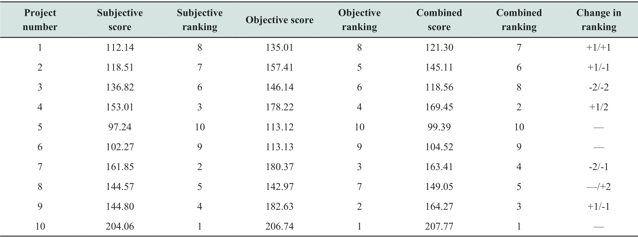 Project number Subjective score Subjective ranking Objective score Objective ranking Combined score Combined ranking Change in ranking 1 112.14 8 135.01 8 121.30 7+1/+1 2 118.51 7 157.41 5 145.11 6+1/-1 3 136.82 6 146.14 6 118.56 8 -2/-2 4 153.01 3 178.22 4 169.45 2+1/2 5 97.24 10 113.12 10 99.39 10 —6 102.27 9 113.13 9 104.52 9 —7 161.85 2 180.37 3 163.41 4 -2/-1 8 144.57 5 142.97 7 149.05 5 —/+2 9 144.80 4 182.63 2 164.27 3+1/-1 10 204.06 1 206.74 1 207.77 1 —